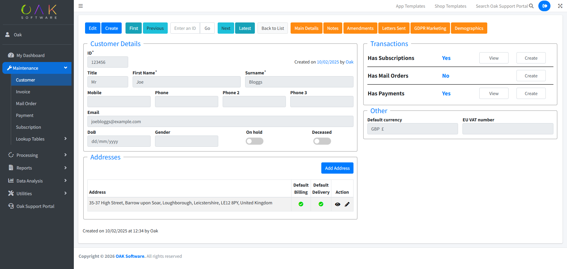 Product database for mail order sales and non-subscription products with dispatch documentation & optional stock control.
